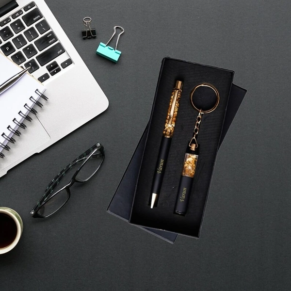 Make a statement of sophistication and style with this exquisite combo of a Premium Personalized Pen and a Custom Engraved Keychain. Featuring a stunning finish in sleek black and gold, this set is the ultimate blend of functionality and elegance. Whether you're looking for a thoughtful gift or a stylish accessory for yourself, this combo is designed to impress.